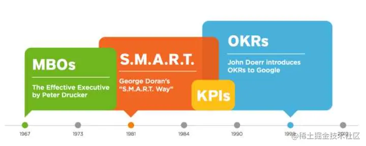 事实上OKR并不是什么新鲜的事物,它是在目标管理的发展过程中,融合了一系列框架、方法和哲学的产物,Peter Drucker在上世纪60年代提出了MBO的思想,此后80年代S.M.A.R.T目标和KPI开始流行起来,1999年John Doerr把OKR引入Google。