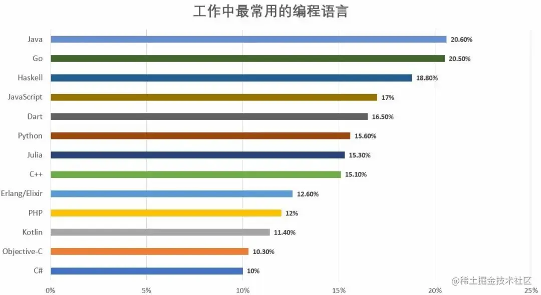 GO排名第二,得票率为 20.3%,不难理解,如今绝大多数的云原生项目都是用 Go 语言编写的,比如 Dokcer、Kubernetes 等,因此GO的起薪自然不低。