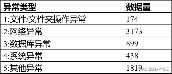 后续实验中发现,由于4:硬件异常数据量少会导致实验结果较差;而硬件异常可以认为是系统异常的一种,因此将4,5进行合并,最终数据集如下: