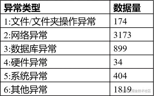 在数据采集过程中发现,上述异常类型及中异常的细分类数据集存在类别不平衡且某些细分类中没有数据的情况,因此采用粗分类进行异常类型分类实验,将日志异常类型分为6类:文件/文件夹操作异常、网络异常、数据库异常、硬件异常、系统异常、其他异常。各分类数据量如下: