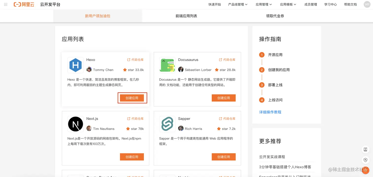 - 创建前端应用。打开快速开始 阿里云-云开发平台,找到Hexo点击创建「创建应用」按钮。