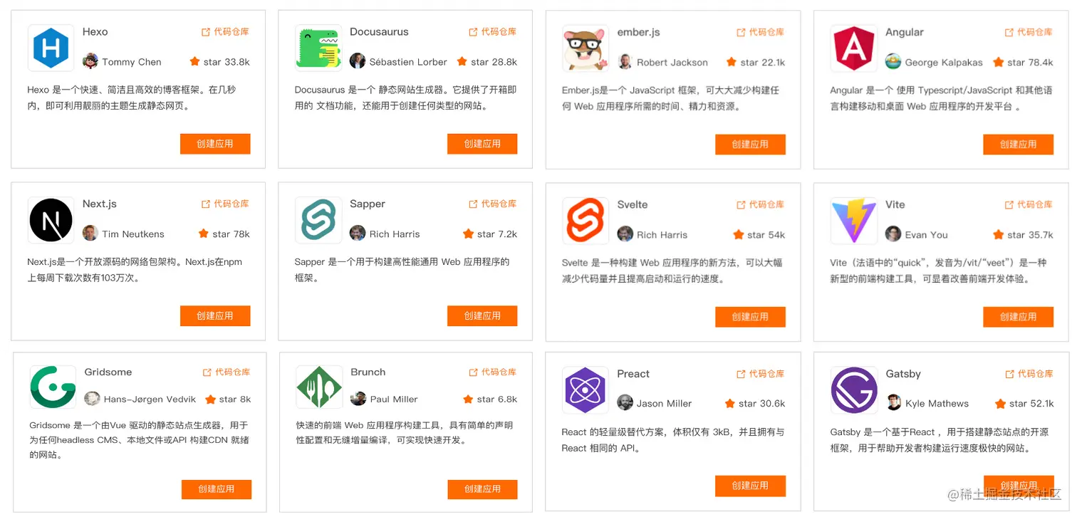 带着以上诸多疑惑进入云开发平台,有多种框架映入眼帘例如:Vue.js、React、Nuxt.js、Next.js、AntDesign等,其中还能看到一些内容管理平台例如:Hexo、Docusaurus、VuePress、Sapper等。在此条件下我们先挑一个较为感兴趣的应用点开去尝试部署,会发现在原来线上部署应用真的像在手机上下载APP一样简单、快速。一个如此、其他便皆是大同小异了,多尝试一些应用发现每个的相同与不同,自然而然挑选最适合自己需求的应用去在日常所用即可。