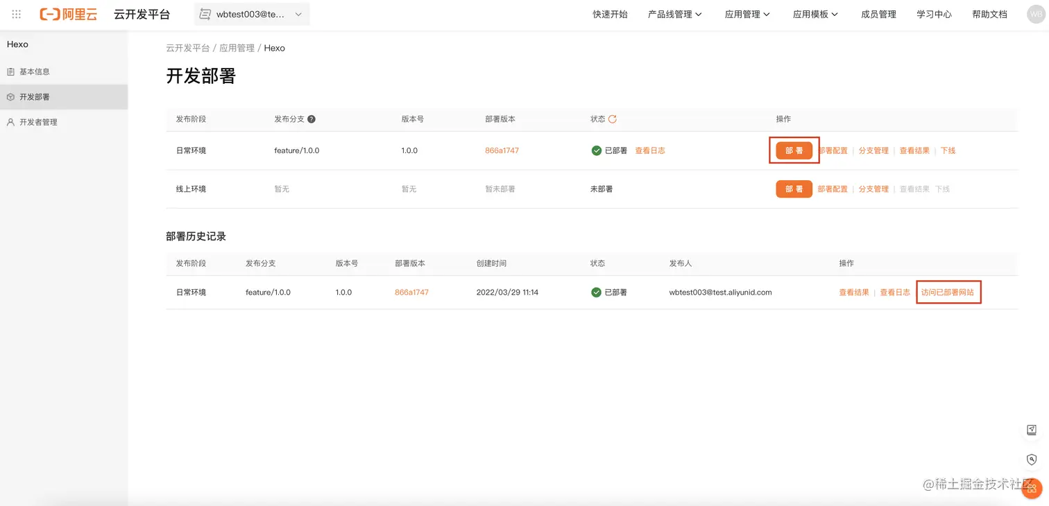- 一键进行应用部署。在应用详情页面点击日常环境的「部署」按钮进行一键部署,部署状态变成绿色已部署以后可以点击访问部署网站查看效果。