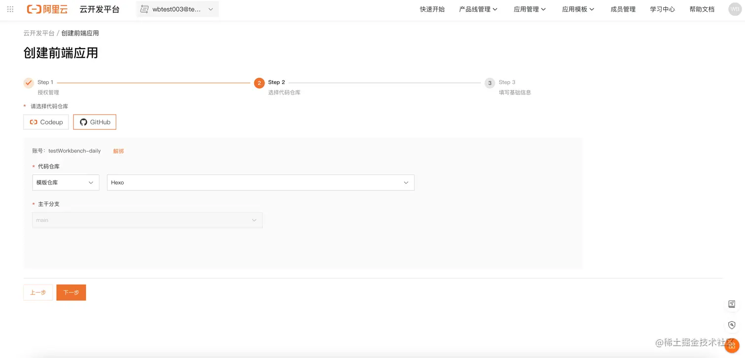 - 绑定Github账号。授权完成后选择来源仓库为Github,按照提示点击去绑定,绑定GitHub帐号,登录后并点击Authorize Aliyunworkben允许云开发平台构建、发布你的GitHub代码为可访问的网站。