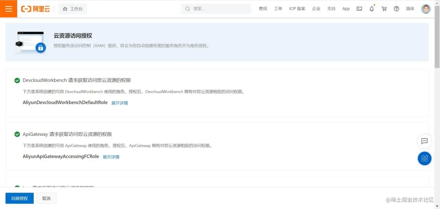 - 云资源访问授权。如果您之前没有使用过云开发平台,会出现云资源授权管理的选项,往下拉出现直至同意授权的字样,点击「同意授权」后出现授权成功,点击进入「下一步」。