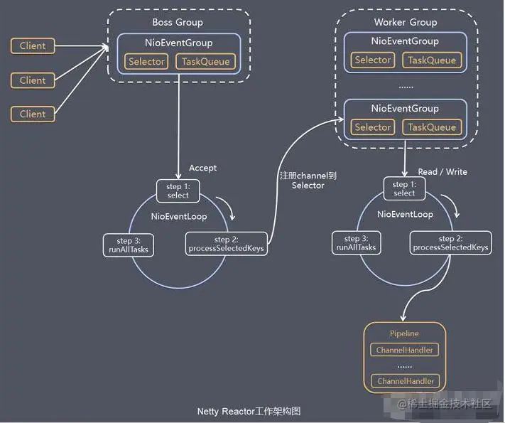 - 当接收到Accept事件,获取到对应的SocketChannel, 封装成 NIOScoketChannel并注册到Worker 线程(事件循环), 并进行维护
