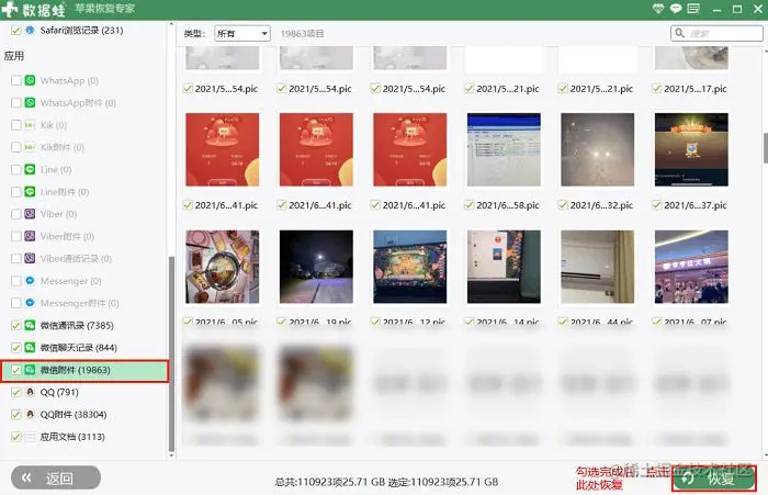微信图片过期怎么恢复原图的方法通过本篇文章已经为大家介绍完毕,一共有两种方法供大家去选择。当我们选择到了合适自己的方法后,对恢复微信图片中过期的图片成功率的提升是非常大的。而我们没有备份的小伙伴则需要使用数据蛙苹果恢复专家去扫描数据恢复了。学会如何正确使用方法的小伙伴记得给小编点赞和收藏哦!