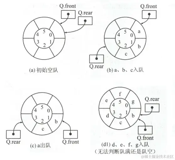 front与rear都为0,最大长度为6; - 将abc入队,队首不变,队尾