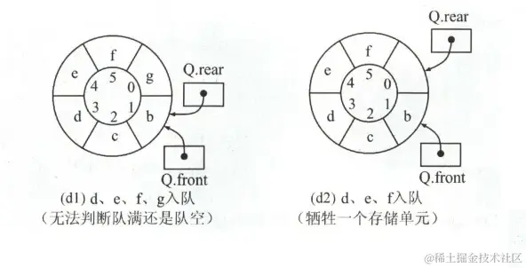 flag,每当入队操作成功后就设置为1,而每当出队操作成功就设置为0;这种方法判空条件为:front==rear && flag == 0,队满的判断条件为:front == rear && flag == 1; -