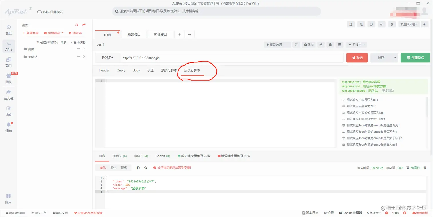 找到 apipost 的后执行脚本,点击进入后执行脚本功能。