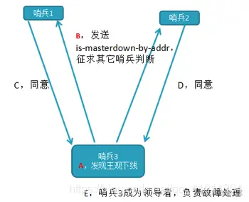 哨兵节点发送is-master-down-by-addr命令, 征求将自己设置为领导者, 由领导者 (他) 进行失败转移