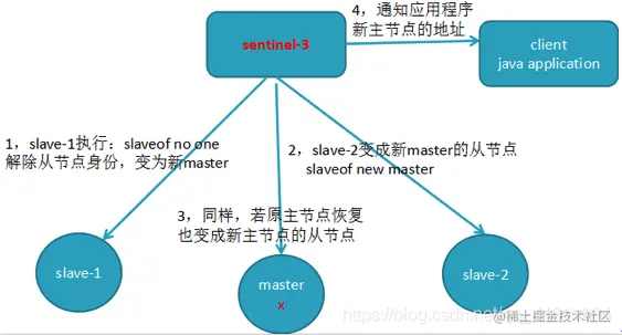 2. 当master客观下线, sentinel节点之间会进行选举领导者进行失败转移 (领导者一般是主观下线的发现者)