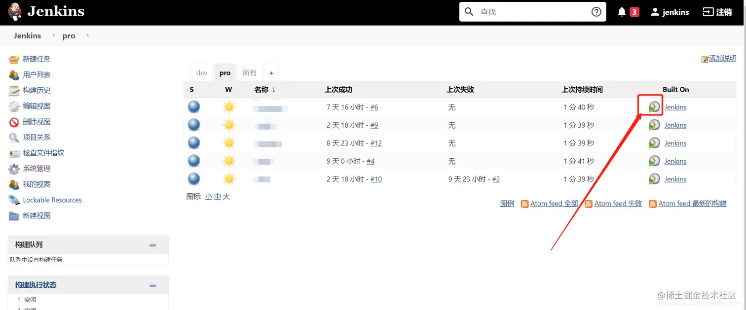 至此配置已完成,每次有新更新代码提交至git,在jenkins首页中,点击相应模块,点击构建即可,如下图: