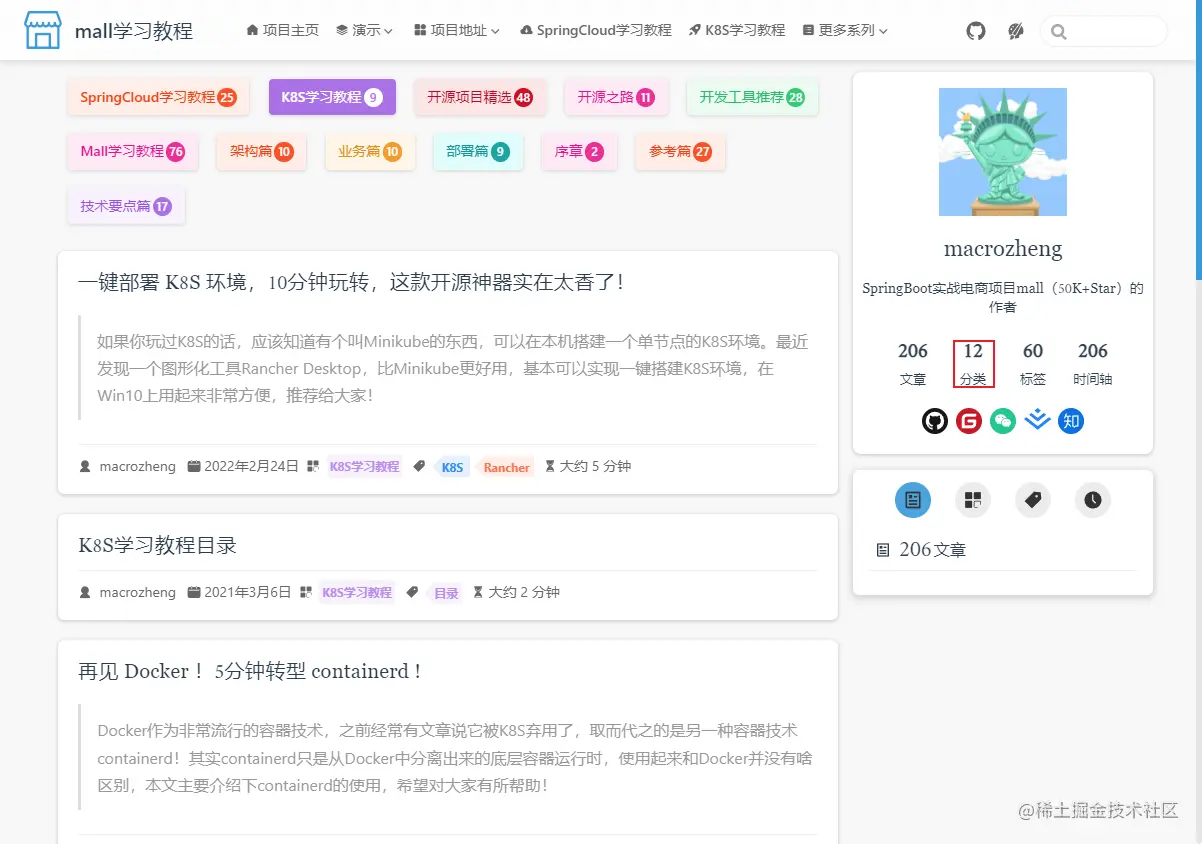 博客形式支持通过分类查看文章,比如看下K8S学习教程。