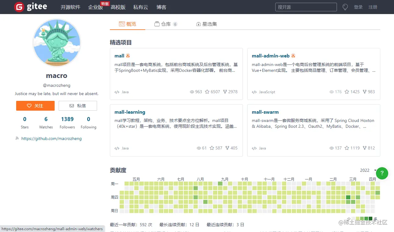 之前有小伙伴问我在Gitee上有没有地址,其实也是有的,通过这里的Gitee按钮就可以直接访问到了!