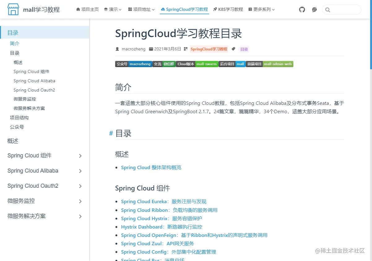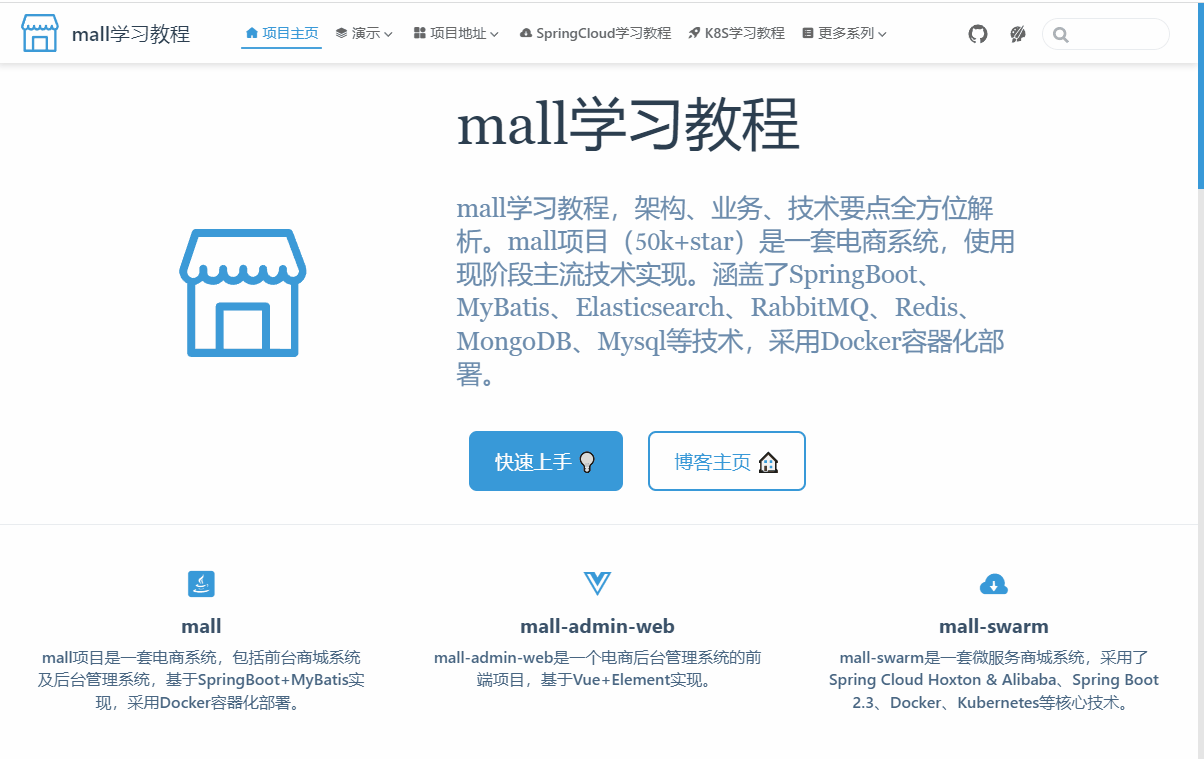 进入首页之后,还是熟悉的mall学习教程内容,6大系列的入口全都放到了顶部导航栏之中,下面依次是是mall学习教程的简介、我的开源项目地址和README。