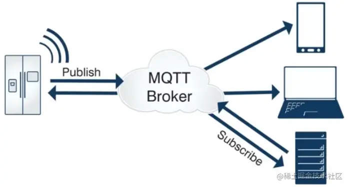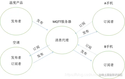 实现MQTT协议需要客户端和服务器端通讯完成,在通讯过程中,MQTT协议中有三种身份:发布者(Publish)、代理(Broker)(服务器)、订阅者(Subscribe)。其中,消息的发布者和订阅者都是客户端,消息代理是服务器,消息发布者可以同时是订阅者。