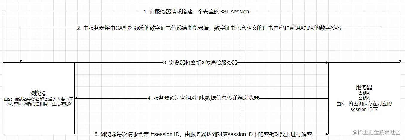 - 浏览器随机生成一个用于对称加密的密钥X,用公钥A加密后传给服务器。