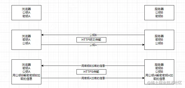 - 浏览器将公钥A通过明文传输给服务器,服务器通过明文传输将公钥B传递给浏览器