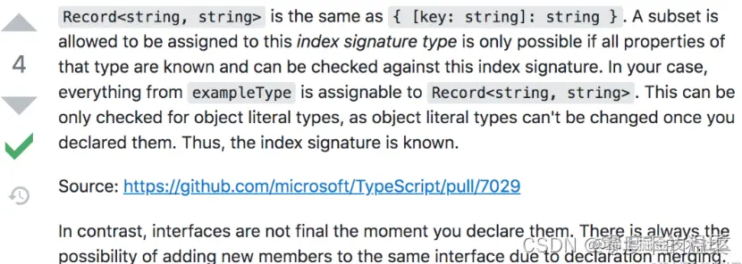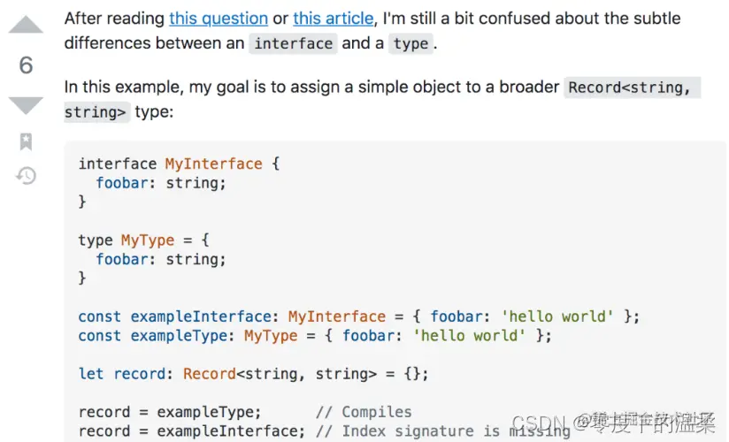 我们发现dataType和dataType1对应的类型一样,但是interface定义的就赋值失败,是什么原因呢?刚开始百思不解,最后我在 stack overflow上找到了一个相似的问题: