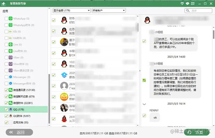 步骤三: 扫描结束后(扫描过程不得随意拔掉数据线),在左侧的应用栏找到【QQ】或【QQ附件】,从中找到您想要恢复的聊天记录,点击右下角的【恢复】即可。