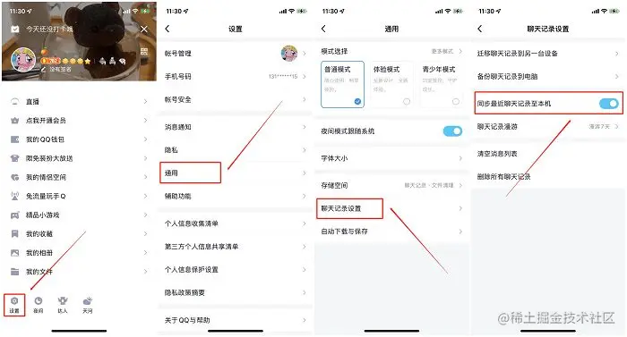 步骤一: 在手机上打开QQ,点击头像,在左下角点击【设置】,进入设置页面后,找到【通用】,然后点击【聊天记录设置】,确保【同步最近聊天记录至手机】是打开状态。