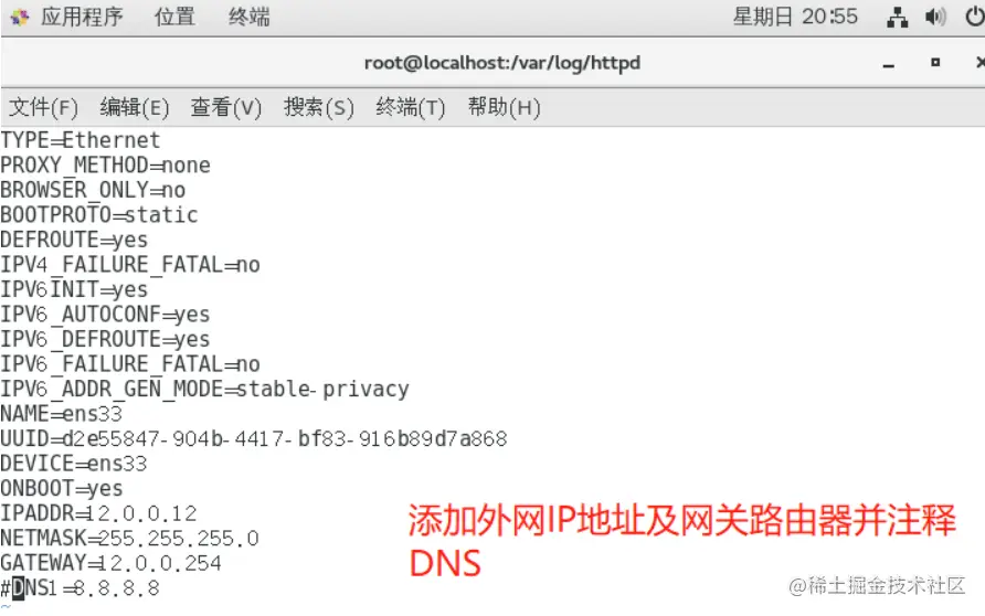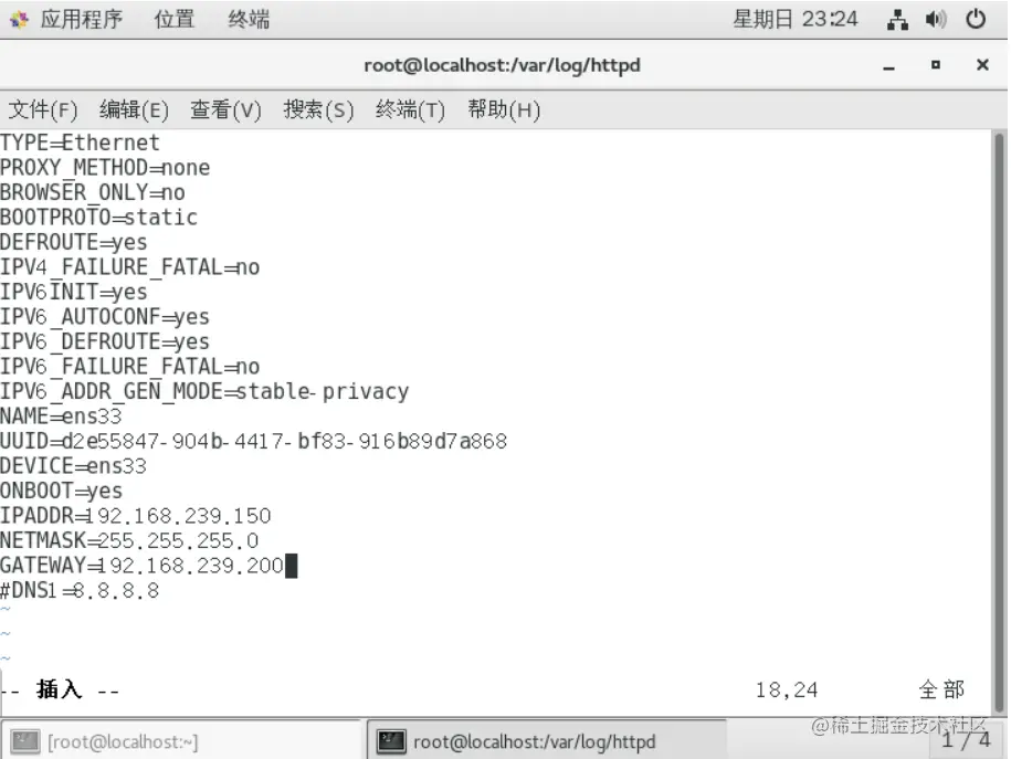 [root@localhost httpd]# vim /etc/sysconfig/network-scripts/ifcfg-ens33 #修改网卡配置文件