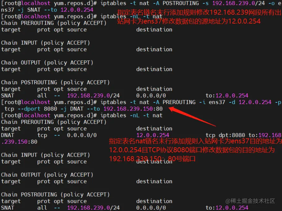 iptables -t nat -A PREROUTING -i ens33 -d 12.0.0.12 -p tcp--dport 80-j DNAT --to-destination 192.168.239.150