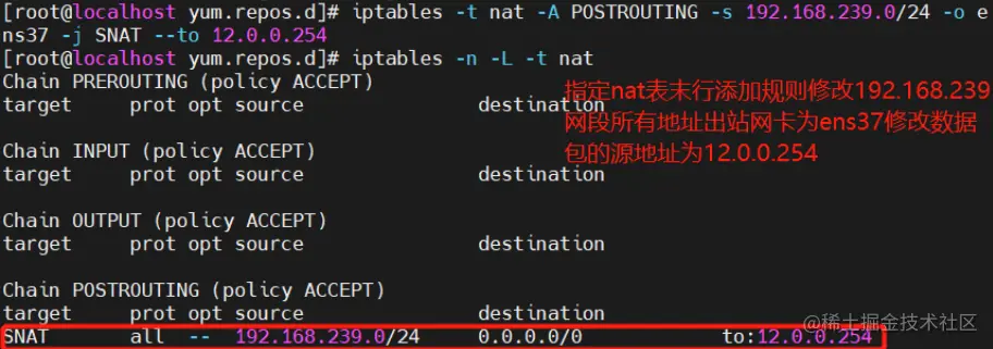 iptables -t nat -A POSTROUTING -s 192.168.239.0/24 -o ens36 -j SNAT --to 12.0.0.1