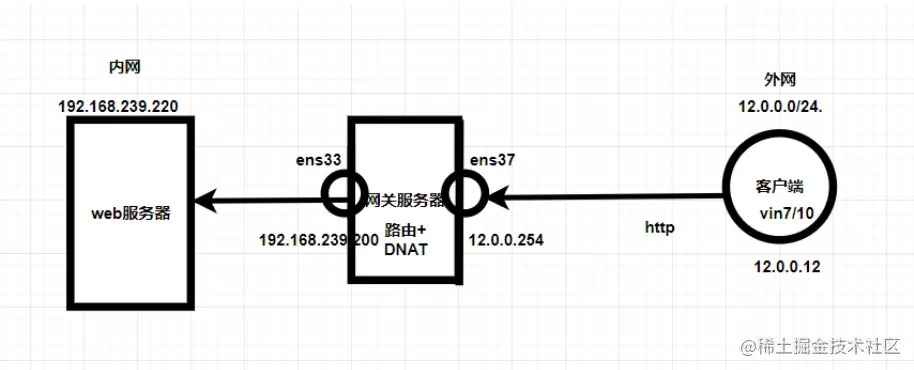 iptables -t nat -A PREROUTING -i ens33 -d 12.0.0.12 -p tcp--dport 80 -j DNAT --to 192.168.239.150