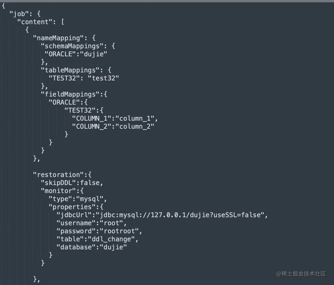 图中映射关系代表源表schema为ChunJun_source下的source1这个表对应对应于目标端ChunJun_sink下的sink1,其中字段映射为 源表的C1字段对应目标id字段,C2字段对应目标name字段