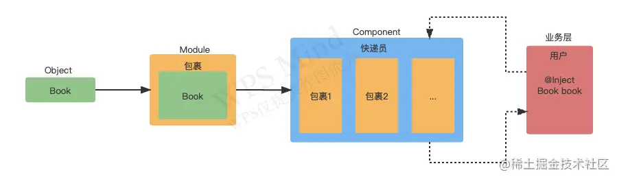 可以使用用户在网上买东西,然后通过快递配送来理解Dagger2的使用原理。用户购买一本书(@Inject注解),然后卖家(Module)进行打包,接着快递员(Component)配送,然后用户就收到了这本书。这样就达到了解耦的目的,只需要使用@Inject注解,就能获取到该对象。