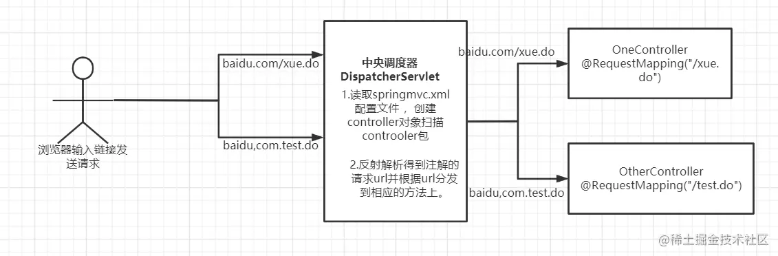请求发送,根据url-pattern,转发发送给中央调度器DispatcherServlet,中央调度器分配请求到自定义的Controller对象上,进行处理。