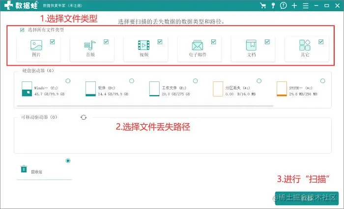 - 第2步:打开软件,选择丢失的文件类型还有路径后,即刻“扫描”;