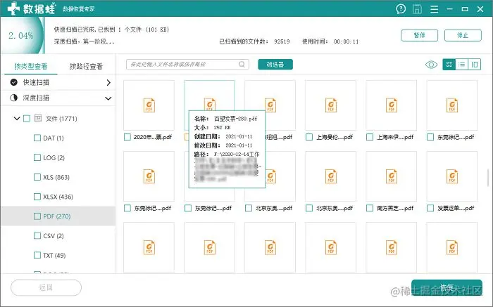- 第4步:在扫描结果中找到自己需要的丢失文件后进行选择,随后点击“恢复”。