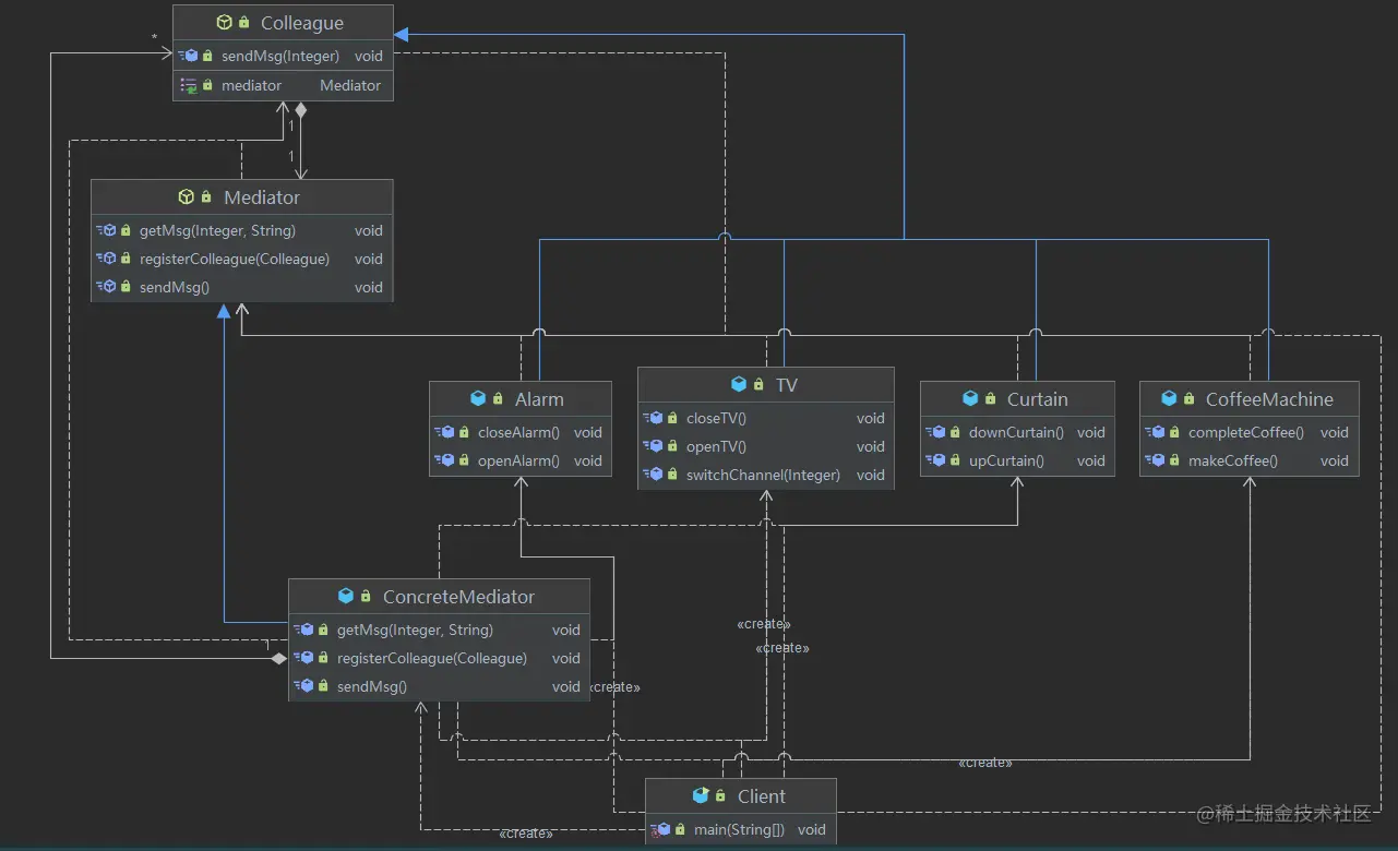 ConcreteMediator【具体的中介者对象】:实现抽象中介者方法,需要知道所有具体的同事类,即以一个集合来管理HashMap,并接受某个同事对象消息,完成相应的任务