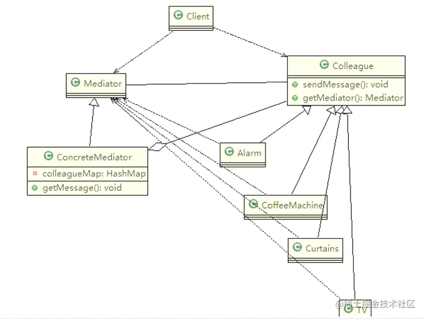 - 4)当系统增加一个新的电器对象时,或者执行流程改变时,代码的可维护性、扩展性都不理想→考虑中介者模式
