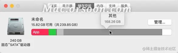 注意:系统会将存储空间根据不同文件类别所占的空间大小显示在条状图上,大部分类型看文字都比较好理解,但对于 “其他” (系统升级到 Monterey 后更名为 “系统数据” )
