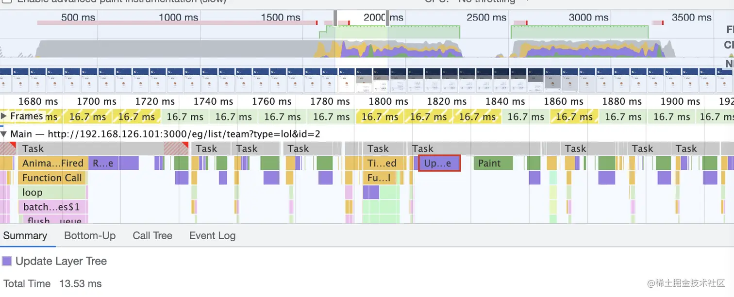 通过performance面板分析出:赛程列表滚动期间,IntersectionObserver行为大量存在,说明猜测正确。