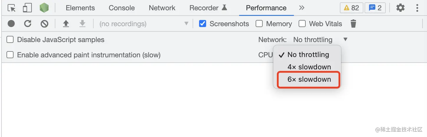 然后用performance面板,先设置6xCPU,即模拟了部分垃圾手机的CPU,但是PC端仍然不卡顿,初步怀疑是手机GPU带不动的问题(鸿蒙手机GPU渲染程序切换为Skia,确实不卡顿)。