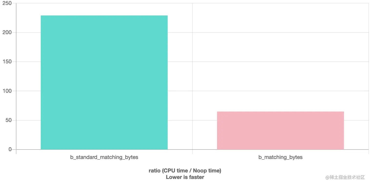 #include <stdlib.h> #include <cstring> const char* s1 = "bpADxkvXqHNaWj2PEnD31uDBijfcR8bm7kR00x7FuDQ4AGz5c1HHCY8jGXEBLUYvIflw0bR1WCEdYWwjGgyToyS0Oes6pCpEDVRd"; const char* s2 = "rq7o9ZRudrLgMeeMJVxRcWL0dJN8n6GefMkqbEcTCznvup1iqTuafrDhDjxYepJczStOJfO8Wh53NOLuje8FnDiC7ZRwOdyQNHw3"; uint64_t matching_bytes_in_word(uint64_t x, uint64_t y) { uint64_t xor_xy = x ^ y; // credit: mula // 7th bit set if lower 7 bits are zero const uint64_t t0 = (~xor_xy & 0x7f7f7f7f7f7f7f7fllu) + 0x0101010101010101llu; // 7th bit set if 7th bit is zero const uint64_t t1 = (~xor_xy & 0x8080808080808080llu); uint64_t zeros = t0 & t1; return ((zeros >> 7) * 0x0101010101010101ULL) >> 56; } uint64_t matching_bytes(const char * c1, const char * c2, size_t n) { size_t count = 0; size_t i = 0; uint64_t x, y; for(; i + sizeof(uint64_t) <= n; i+= sizeof(uint64_t)) { memcpy(&x, c1 + i, sizeof(uint64_t) ); memcpy(&y, c2 + i, sizeof(uint64_t) ); count += matching_bytes_in_word(x,y); } for(; i < n; i++) { if(c1[i] == c2[i]) { count++; } } return count; } uint64_t standard_matching_bytes(const char * c1, const char * c2, size_t n) { size_t count = 0; size_t i = 0; for(; i < n; i++) { if(c1[i] == c2[i]) { count++; } } return count; } static void b_standard_matching_bytes(benchmark::State& state) { for (auto _ : state) { auto res = standard_matching_bytes(s1, s2, 100); benchmark::DoNotOptimize(res); } } BENCHMARK(b_standard_matching_bytes); static void b_matching_bytes(benchmark::State& state) { for (auto _ : state) { auto res = matching_bytes(s1, s2, 100); benchmark::DoNotOptimize(res); } } BENCHMARK(b_matching_bytes);效果如图