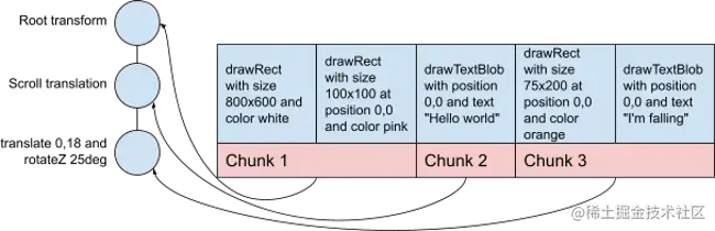 - {显示列表和绘画块|Display lists and paint chunks}: 将被传入到合成线程中,并被光栅化和分层算法所消费