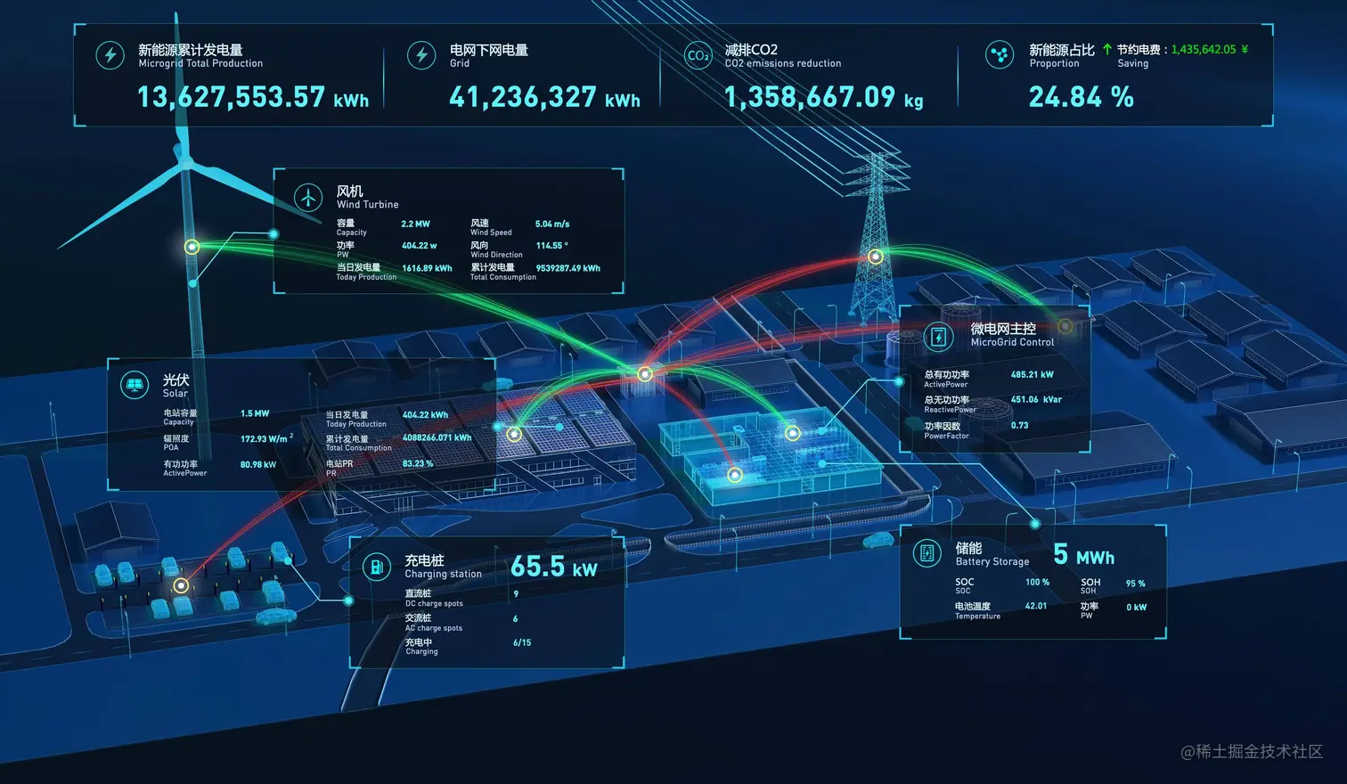 能源管理绿色化: 利用SovitJs可视化平台和GIS技术的应用,进行全方位的数字化建设,使风电场的监控更加直观,控制更加精确,提高风电场的整体管理水平和运营效率,推进风电场的绿色化和智能化转换升级过程。