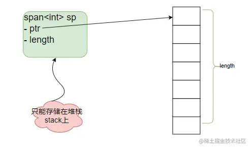 // 截取自Span源码,表征一段连续内存的关键属性 Pointer & Length 都只能从构造函数赋值