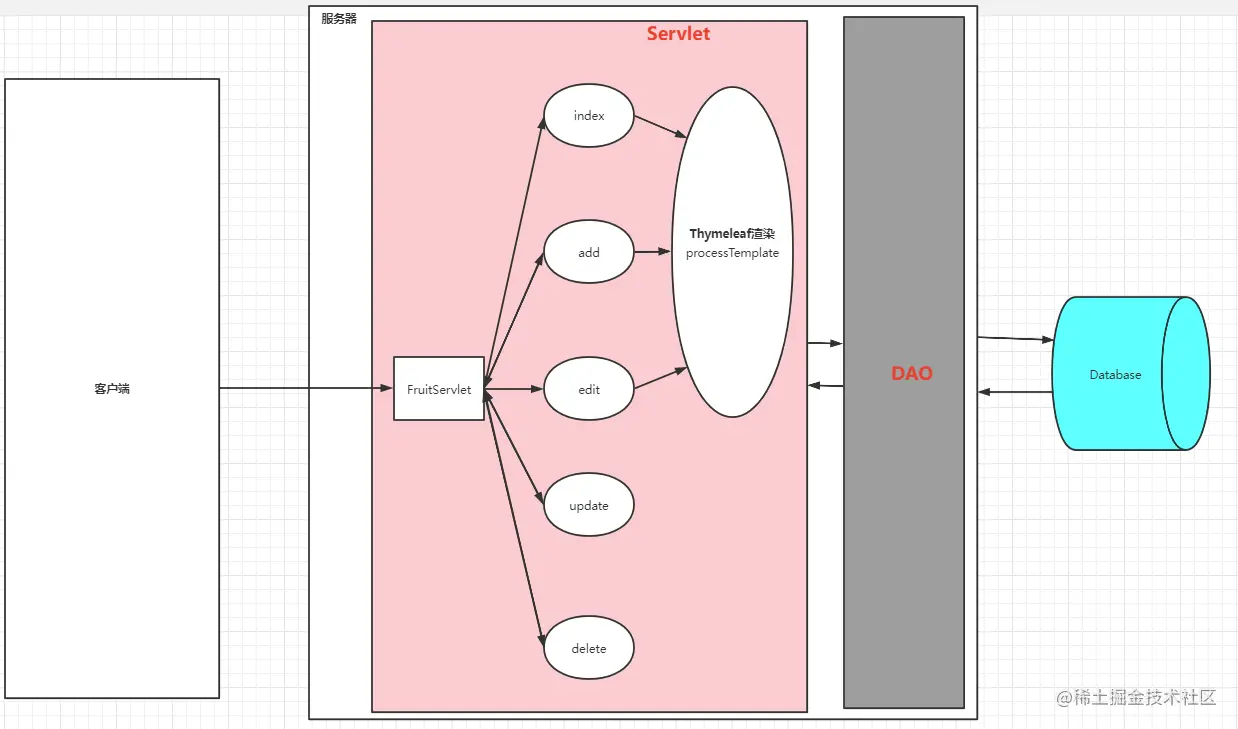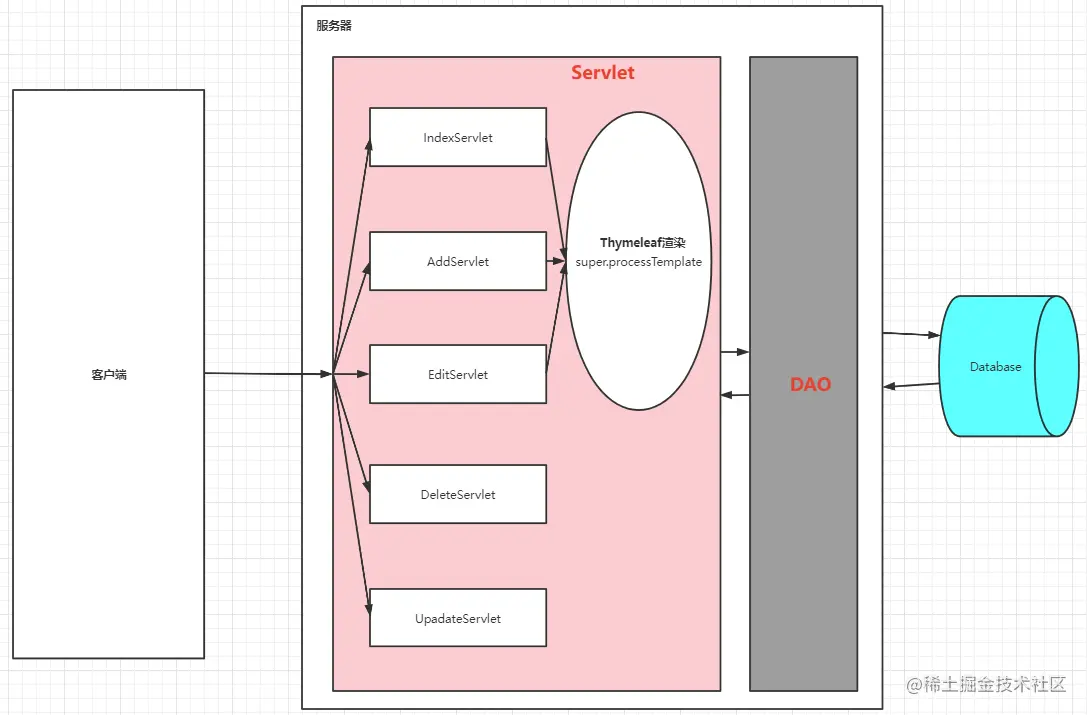 - 服务器启动并调用Servlet,Servlet根据客户端请求生成响应内容并将其传给服务器