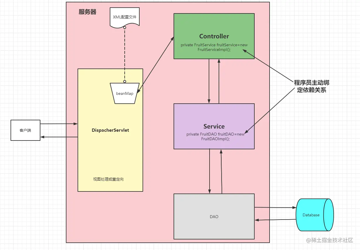 在DispatcherServlet类的初始化方法中,我们会实例化BeanFactory对象,从而创建IOC容器。