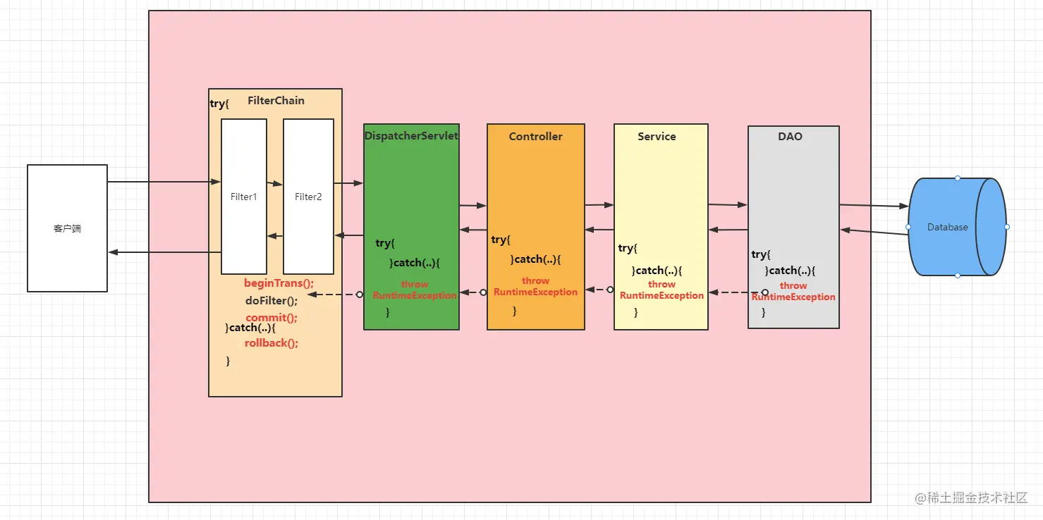 应该从最底层的DAO开始,抛出RuntimeException异常,中间层捕获后继续抛出,直至最上层的Filter捕获后执行事务回滚。