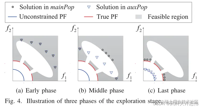 - 在探索阶段,mainPop 旨在寻找可行区域并保存可行的解决方案;而 auxPop 在不考虑任何约束的情况下探索整个搜索空间,并保留具有良好目标值的解决方案,无论可行性如何。在这个阶段,auxPop 是前向搜索的主力,引导 mainPop 穿过不可行区域。