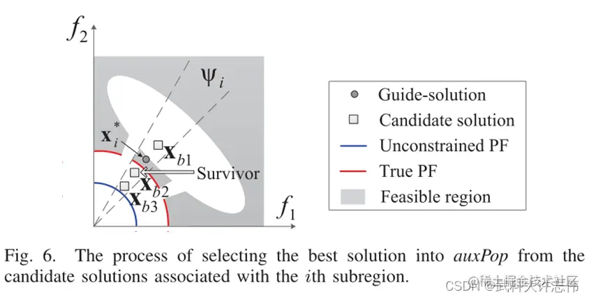- 第二个步骤是更新第i个子域中的auxPop中的解(line11-17).xi被用来引导auxPop在第i个子域中的更新。首先,我们根据公式(8),将auxPop和子代的合种群CP2t中第i个子域对应的解挑选出来并存档到Bi中。然后,Bi中具有更小的gTE值的解被挑选出来放进种群Hi中。如果Hi是一个空集,xi被放进新的auxPop种群中。否则,具有最小约束的解从候选解集Hi中选出并添加到新的auxPop中。这个过程如图6所示,其中Bi这个种群中有三个解分别是xb1,xb2,和xb3. Xb2和xb3相比于xi*来说具有更好的gTE值,因此他们都被选择进入到Hi中。然后xb2作为最优秀的解被挑选进auxPop中,以其最小的约束违反值。