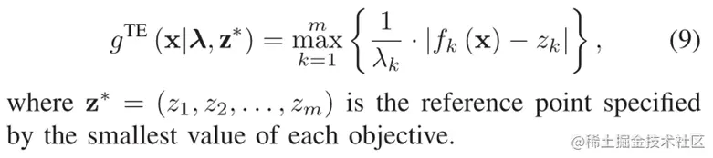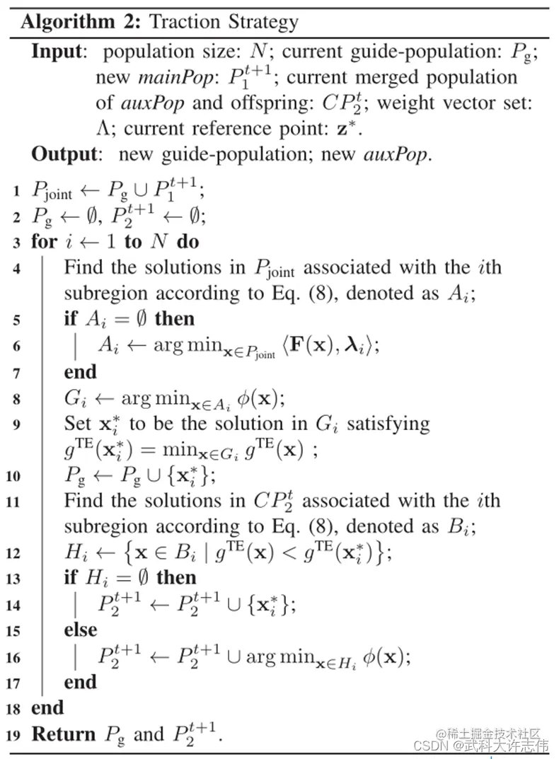- 首先确定对于每个子域的引导解guide-solution (line 4-10), 从合种群中挑选子区域中的解,表示为Ai. 如果Ai是一个空的集合,就从Pjoint中挑选离第i个权重向量最近的解进入Ai集合中。并且Ai集合中具有最小约束违反的解被挑选出来作为候选解集Gi. 在候选解集Gi中的中具有最小gTE值的解被挑选出来作为第i个子区域中的引导解,表示为xi*, 随后,xi* 被收入到引导种群Pg中。